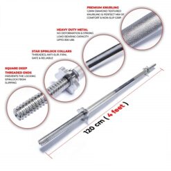 DIMENSION -Weightlifting Bicep Barbell Length – 120 cm (4 feet). Package Contents 1 Weight lifting Rod and 2 Safety Barbell Locks.